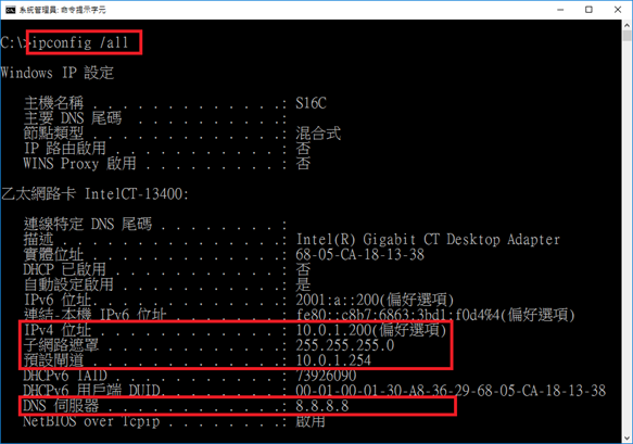 可以先開啟 “命令提示字元”,輸入指令 ipconfig /all,來顯示此電腦所設定的 IP Address 及相關設定。如下圖: