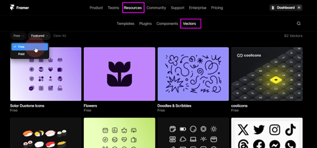 Framer 內建繪圖工具,支援直接編輯與管理向量圖集,適合製作圖示與字形。官網提供大量由社群開發的免費向量素材。