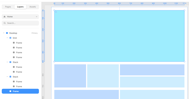 可由圖層上檢視,使用Rows橫列、Columns直欄繪製的區塊,即是Stack堆疊結構,Grid網格工具繪製的區塊當然是Grid網格結構。