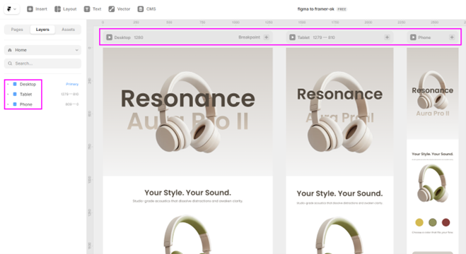 除了剛講的 Stack 跟 Grid,Framer 最強的地方就是可以按個鍵就跑出平板跟手機的斷點(Breakpoints)。 這些不同尺寸的工作區域會全部排在一起,您改電腦版的設計時,旁邊的手機版會同步跟著變,不用切換視窗就能一次搞定三種尺寸!這點真的比其他架站工具好用太多,以前都要一個個點開預覽來改,現在直接全開。說真的,用過這種『一次做三份』的流暢感就回不去了!