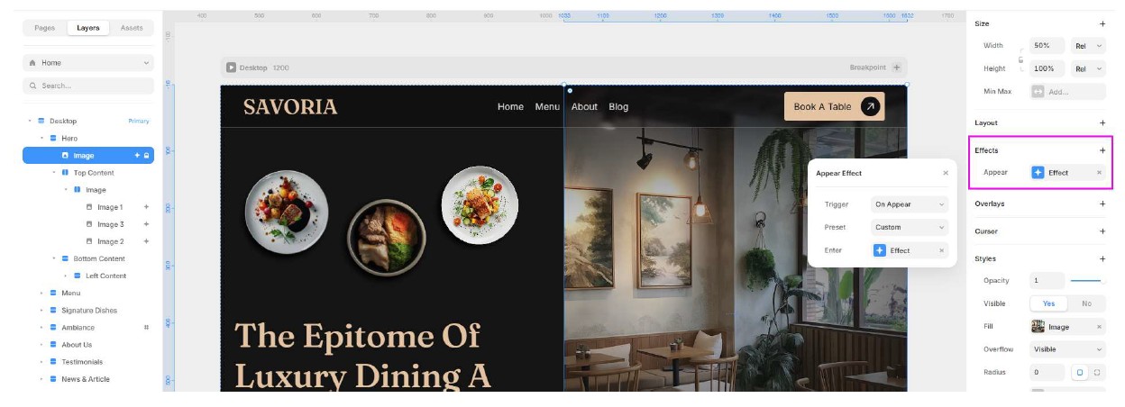 在 Framer 裡要做動效真的超簡單,點幾下就能搞定。像是那種很酷的視差滾動(Parallax),讓物件隨捲動位移,網站瞬間就會變得很有質感。 不過我也要提醒一下,動效不是加越多越好,如果滿螢幕都在飛,使用者看久了會覺得很煩、心很累,反而變得很廉價。好在 Framer 的預設參數調得滿剛好的,隨手拉出來的效果都不會太浮誇,滿容易控制在那個『剛剛好』的力道。