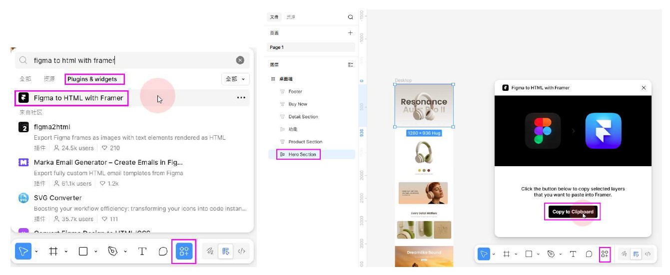 如果您本來就是用 Figma,那跳轉到 Framer 真的超方便。您不用在那邊重拉專案,可以直接把 Figma 的設計稿丟過去。 只要裝個插件(Plugin),像是 Framer Copy Paste,想搬什麼就直接『複製、貼上』,元件就過去了。說白了,您可以把 Framer 當作 Figma 的延伸,直接把畫好的設計稿變成能動的網頁 Code。甚至還有一款 Figma to HTML 的外掛,按幾下就轉換完成,這對開發流程來說真的省事很多!