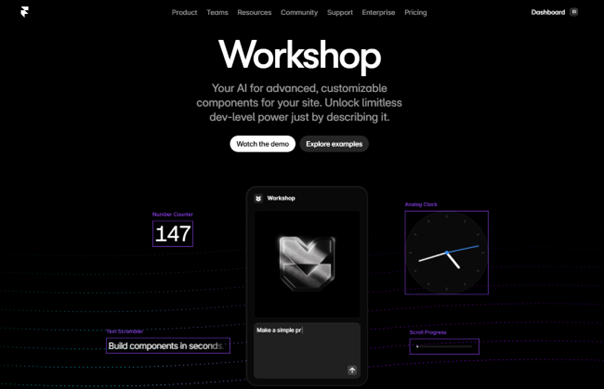 Framer Workshop 是 Framer 於 2025 年推出的全新 AI 功能,旨在透過指令(Prompt)直接生成原本需要撰寫自定義程式碼(Custom Code)的高級互動組件與視覺效果。